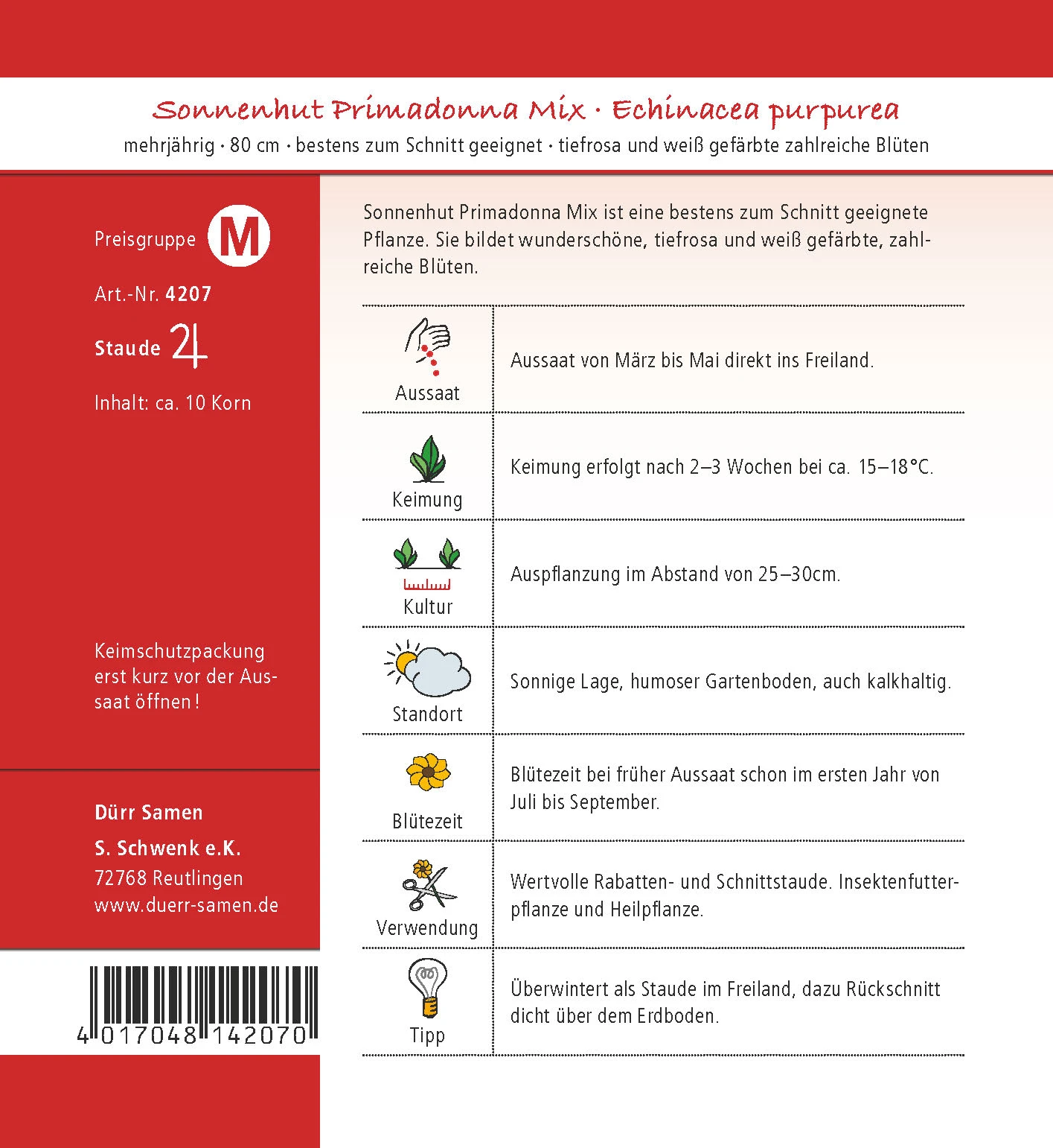 Sonnenhut Primadonna Mix ist eine bestens zum Schnitt geeignete Pflanze. Sie bildet wunderschöne, tiefrosa und weiß gefärbte, zahlreiche Blüten.