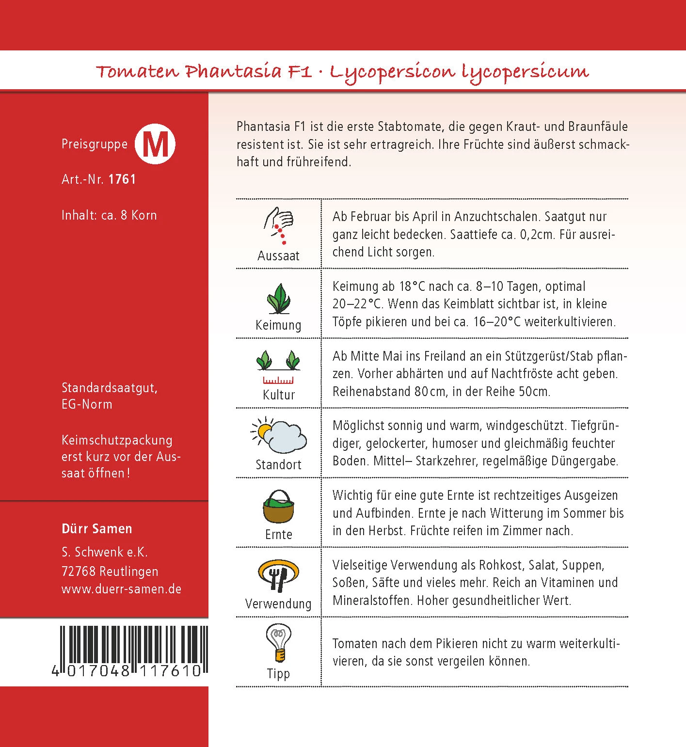 Phantasia F1 ist die erste Stabtomate, die gegen Kraut- und Braunfäule resistent ist. Sie ist sehr ertragreich. Ihre Früchte sind äußerst schmackhaft und frühreifend.