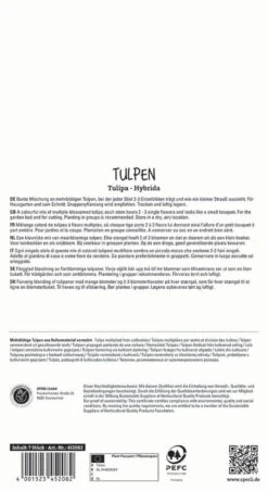 Farblich harmonisch abgestimmte gefüllte frühe Tulpenmischung. Besonders für Kübel und Kästen, aber auch für den Hausgarten. Gruppenpflanzung wird empfohlen.Trocken und luftig lagern.
