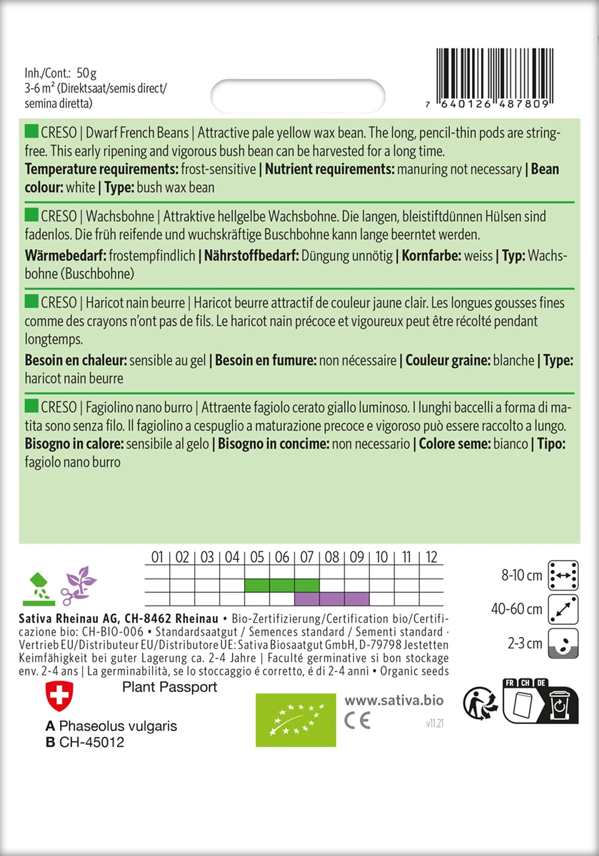 Attraktive hellgelbe Wachsbohne. Die langen, bleistiftdünnen Hülsen sind fadenlos. Die früh reifende und wuchskräftige Buschbohne kann lange beerntet werden.